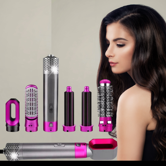 Perie Rotativă 5 în 1 cu Aer Cald 1000W – Uscător, Ondulator și Placă de Îndreptat, Tehnologie Ceramică, 5 Accesorii Interschimbabile, Roz/Argintiu