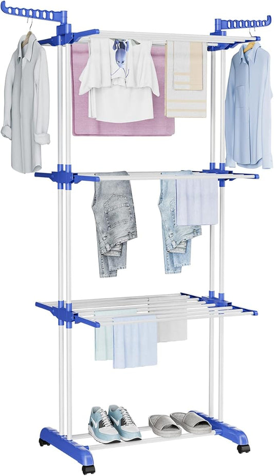 Uscător de rufe vertical pliabil cu 3 nivele, 170 cm, cu roți și suport umerașe – compact, mobil și rezistent
