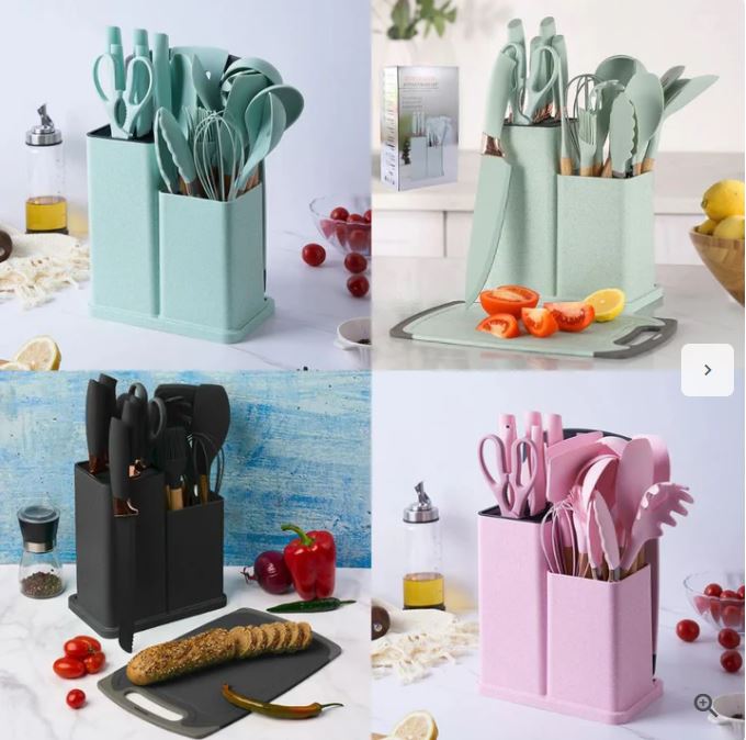 Set ustensile bucătărie 19 piese, silicon alimentar & lemn, termorezistente, antiaderente, cu suport blat